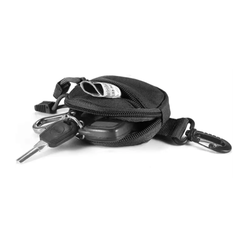 Tasken kommer i en kraftig og slidstærk kvalitet, har 2 lommer med lynlås, til opbevaring af dine mest essentielle ting til turen. Tasken har 1 stærk strap, til fastgørelse i f.eks. bæltet. Ydermere har den en karabinhage til fastgørelse i taske eller lign.