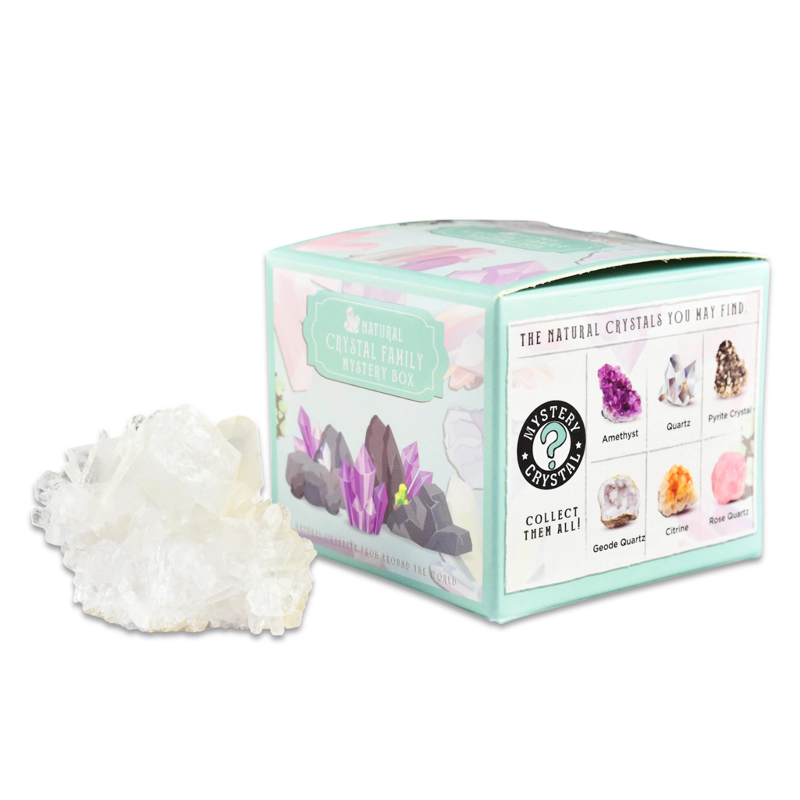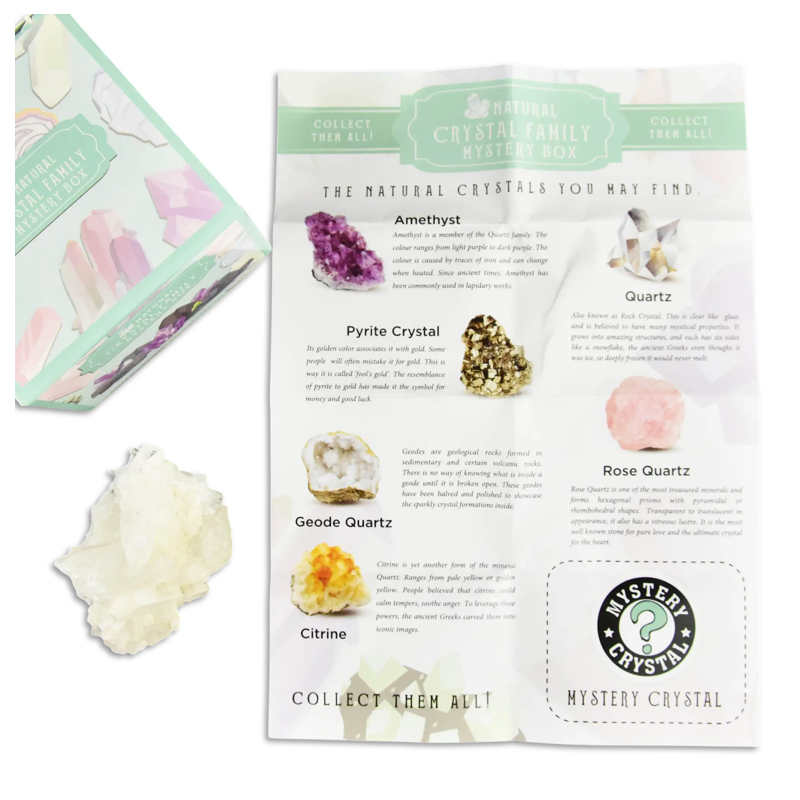 Giv oplevelsen et twist af magi og nysgerrighed med vores Crystal Mystery Box! Hver æske indeholder én af de 6 forskellige krystaller. – perfekt til børn, samlere eller som en unik gaveidé.