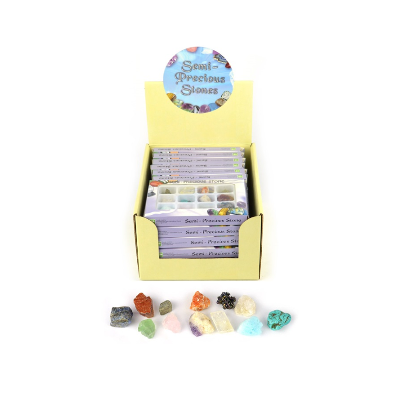 Æsken indeholder 12 forskellige halvædelsten. Som kan tages ud og studeres - f.eks. under et mikroskop. Pakkens mål: 14 × 1 × 10 cm