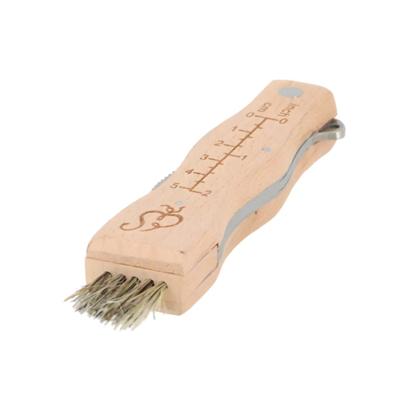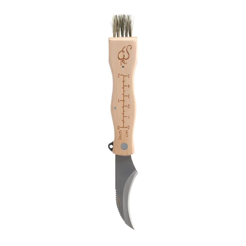 med børste og måleskala er ideel til skovture. Knivbladet i rustfrit stål skærer rent uden at skade svampenes netværk, mens den takkede bagside fjerner det yderste lag på hætten. Børsten i svinehår gør rengøringen enkel under opsamling, og bøgetræskaftet med centimeter-mål hjælper dig med at måle dine fund. Kniven er kompakt, vejer kun 110 g og kombinerer funktion, kvalitet og praktisk design til enhver svampeentusiast.<br />