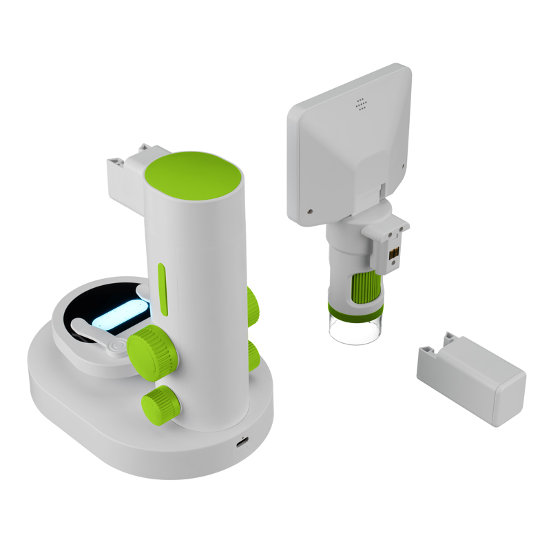 - Kan bruges som håndmikroskop, lup og bordmikroskop