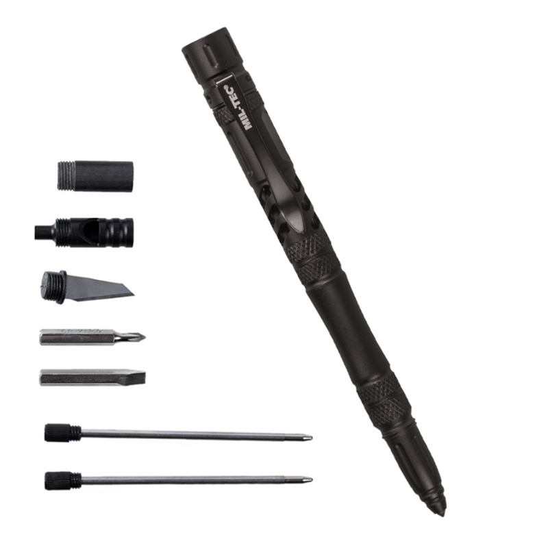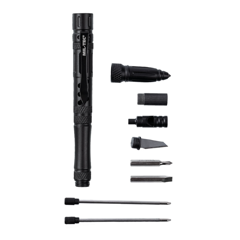 Mil-Tec løfter sin taktiske kuglepen til et helt nyt niveau. Kuglepennen indeholder 7 forskellige værktøjer, som du kan montere på pennen efter behov. Det hele er pakket i en gaveæske.