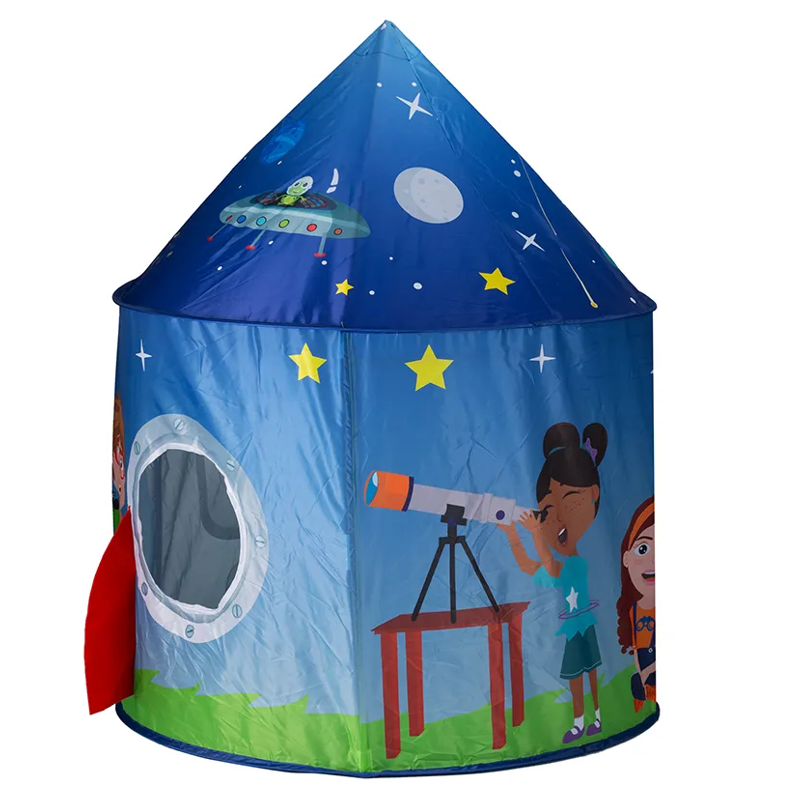 Det smarte telt er sat op, i nogle få enkle trin og giver den rette atmosfære til dine rumudforskninger. Med en størrelse på 100x100x130cm giver teltet masser af plads til at planlægge de næste observationer med en ven. Gennem de to runde vinduer kan du altid holde øje med dine omgivelser fra teltet, hvis i skulle blive invaderet af rumvæsner.