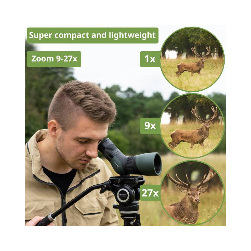 Trods det kompakte design på kun 20cm og med en vægt på 636g, kan du opnå enormt lysstærke billeder helt hen til skumringen, grundet den 56mm store lysåbning og 9-27x forstørrelse.