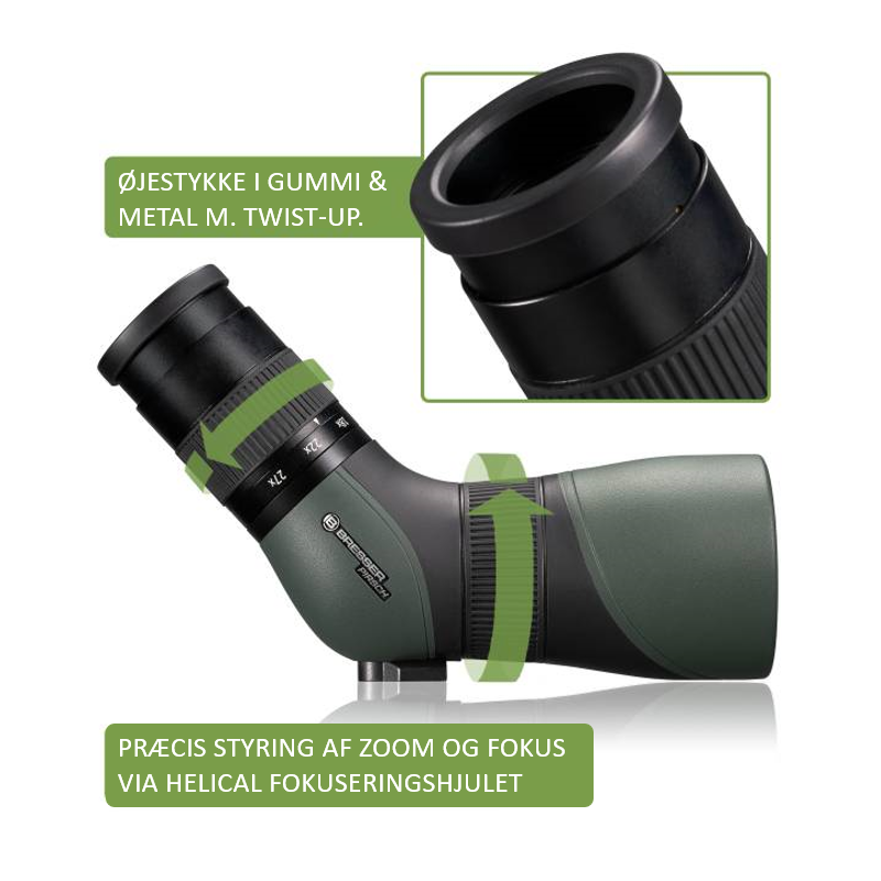 - twist-up øjestykke med klikstop gør den ekstra brugervenlig, både for personer med eller uden briller at udnytte det fulde synsfelt.
