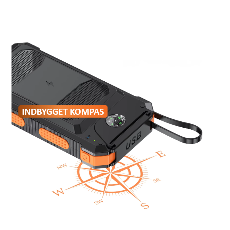 Kraftfuld og alsidig solcelle-powerbank med kompas og lommelygte