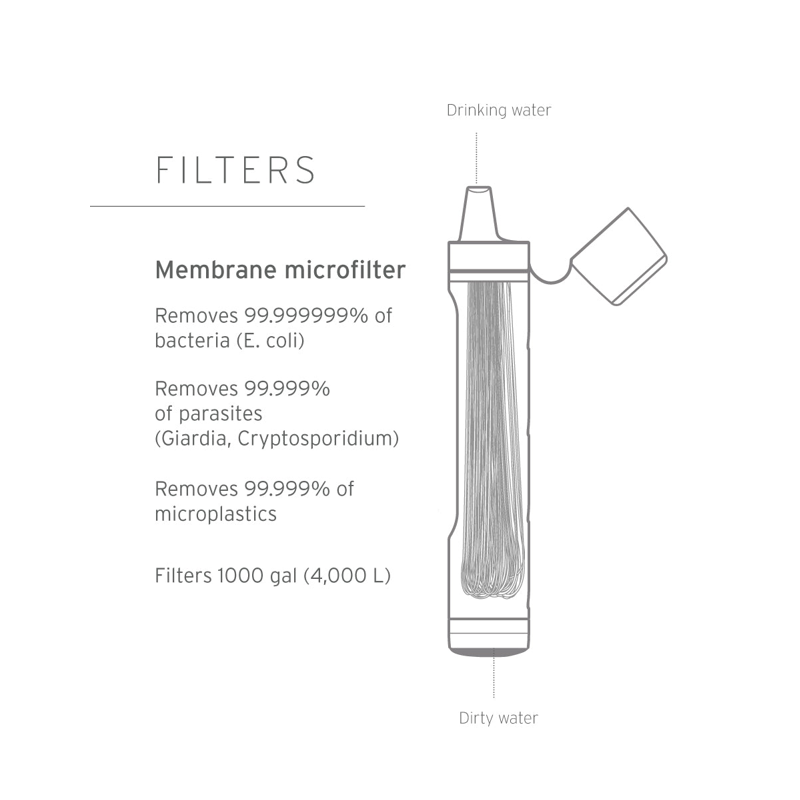 - Drik direkte fra søer, floder og bække, eller fyld en beholder og brug dit sugerørs-vandfilter på farten med beskyttelse mod bakterier, parasitter, mikroplast, slam, sand og uklarhed.