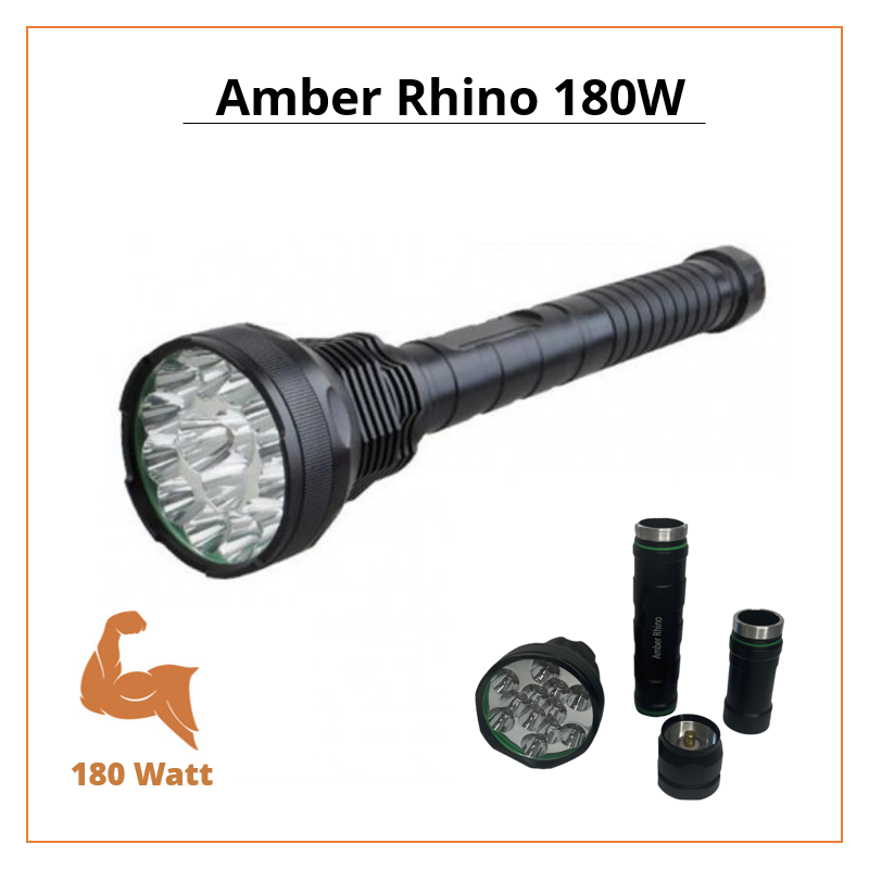 Få max udbytte med en Amber Rhino på hele 180Watt'. Med hele 12 kraftige LED pærer har lygten en sigtbarhed op til 300m. Lygten har som standard plads til hele 3 kraftige 18650 eller 26650 Litium batterier.