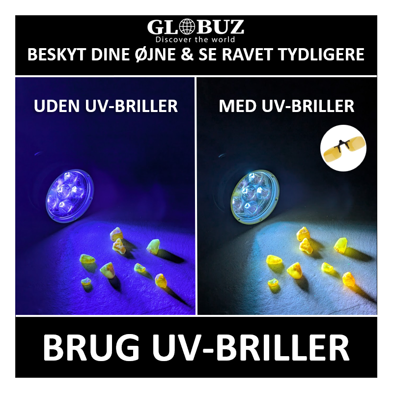 Med børne-UV-briller fra Globuz får dine børn ikke bare den nødvendige beskyttelse mod skadeligt ultraviolet lys, men også en langt bedre oplevelse i jagten på rav. Brillerne filtrerer det overskydende lys fra lygten, så ravet træder tydeligt frem og bliver endnu nemmere at få øje på i sandet. Det er både sikkert og smart – og gør skattejagten endnu sjovere!