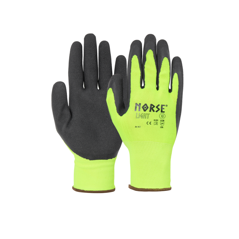 NORSE Light er en tætsiddende overgangshandske, der sikrer at du har god føling med håndfladen og fingrene, perfekt hvor der kræves præcision med det objekt, man arbejder med. Den tætsiddende ribkrave bevirker, at handsken ikke glider af. En virkelig god overgangshandske med en bred vifte af anvendelses muligheder. Den er sømløs strikket i polyester med blød Latex-foam belægning, der sikre en behagelig pasform, uden trælse syninger. Handsken er halvdyppet og kommer med en ribsstrikkant af polyester med elastik. Handsken er herudover lavet i en high visibility farve, hvilket gør brugen mere synlig.