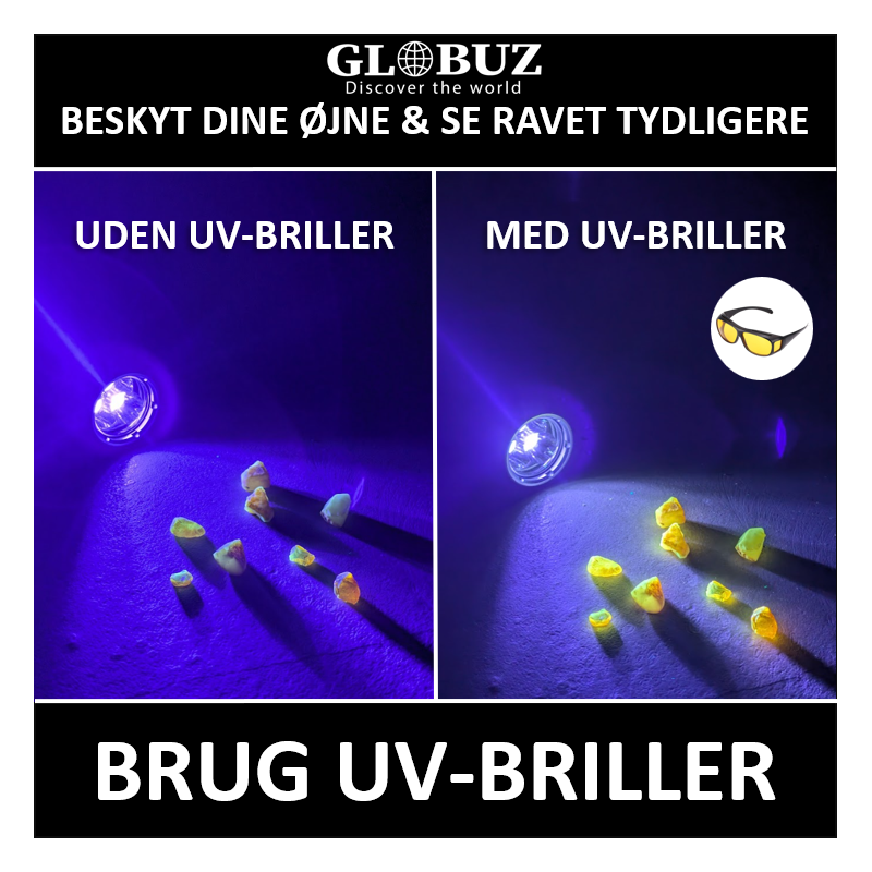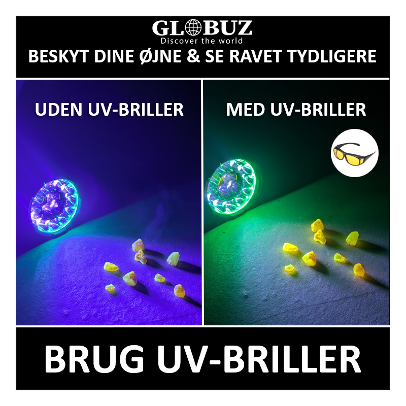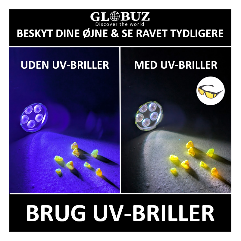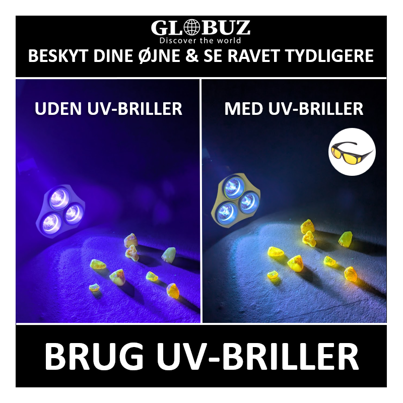 UV-Brille til beskyttelse mod ultravioletlys og øjenskader. Fremhæver ravet ved brug af ravlygter og gør det lettere at se i sandet. Anvendes desuden af mange som køre-brille i bilen. Brillen kan anvendes uden på alm. briller.