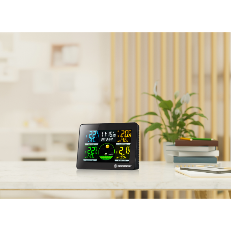 Multifunktionel vejrstation med hygrometer inkl. 3 temperatursensorer. Det store farve display sikrer et hurtigt overblik over de mange forskellige informationer som vejrstationen kan vise. De 3 medfølgende temperatursensorer kan placeres op til 30 meter væk fra vejrstationen og gør det dermed muligt at få målinger fra flere forskellige steder, f.eks. huset, haven eller garagen. Bresser yder 5 års garanti ved registrering.