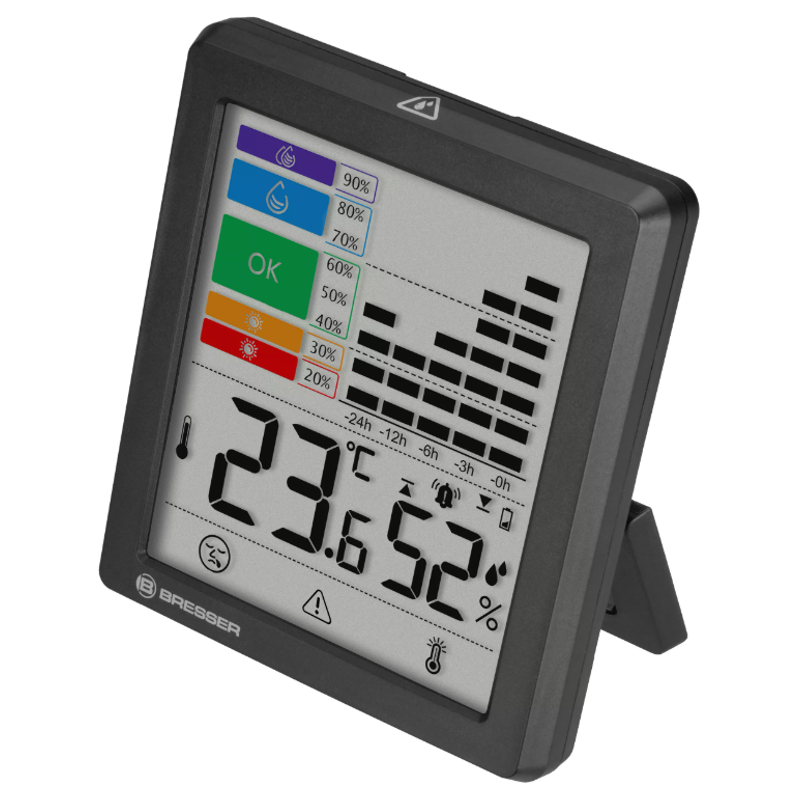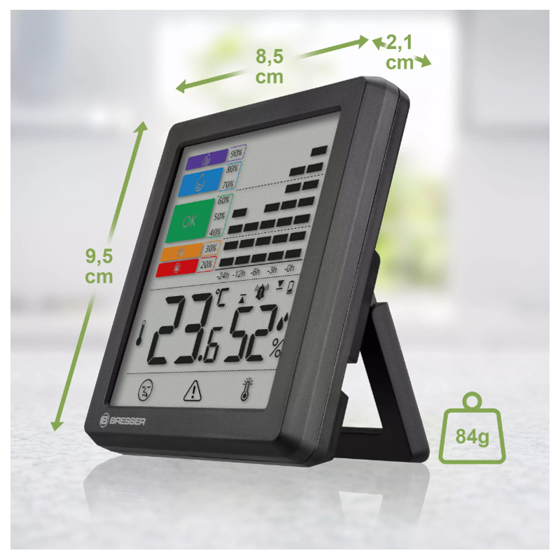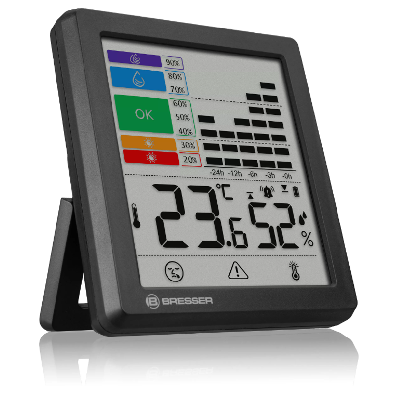 Når det handler om dit velbefindende, skal du ikke nøjes, når det gælder om at opretholde et sundt indeklima. Hold styr på dit hjemmemiljø med BRESSER Termo-Hygrometer med Skimmelalarm. Det måler præcist temperatur og luftfugtighed og imponerer med sine omfattende advarselsfunktioner. Du ved altid, hvornår du skal varme, ventilere, befugte eller affugte.